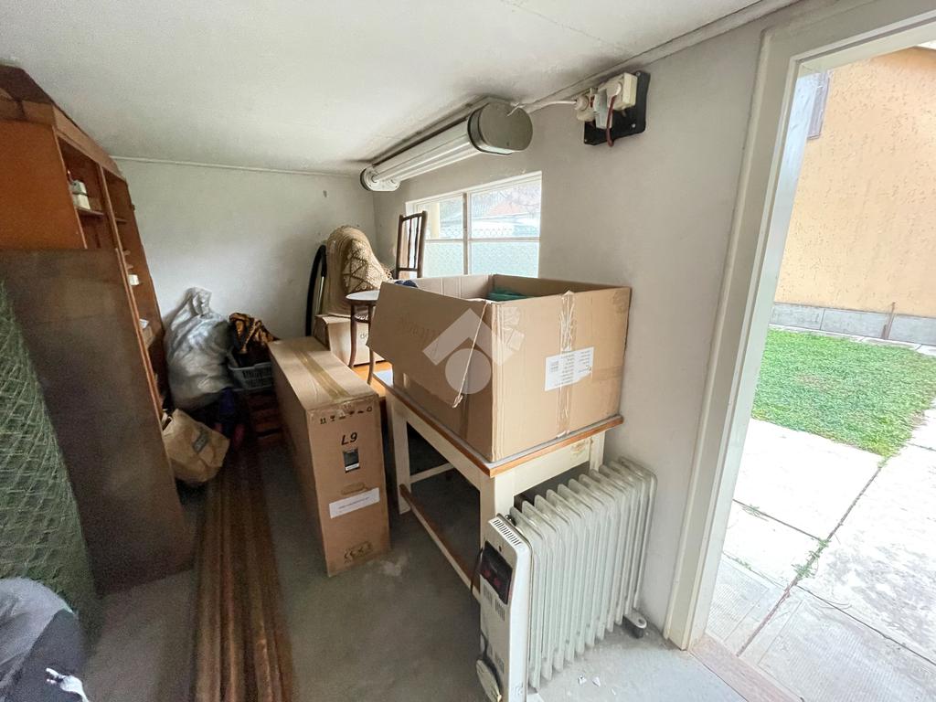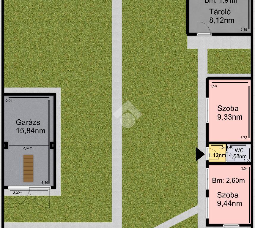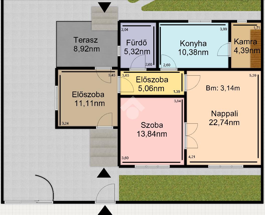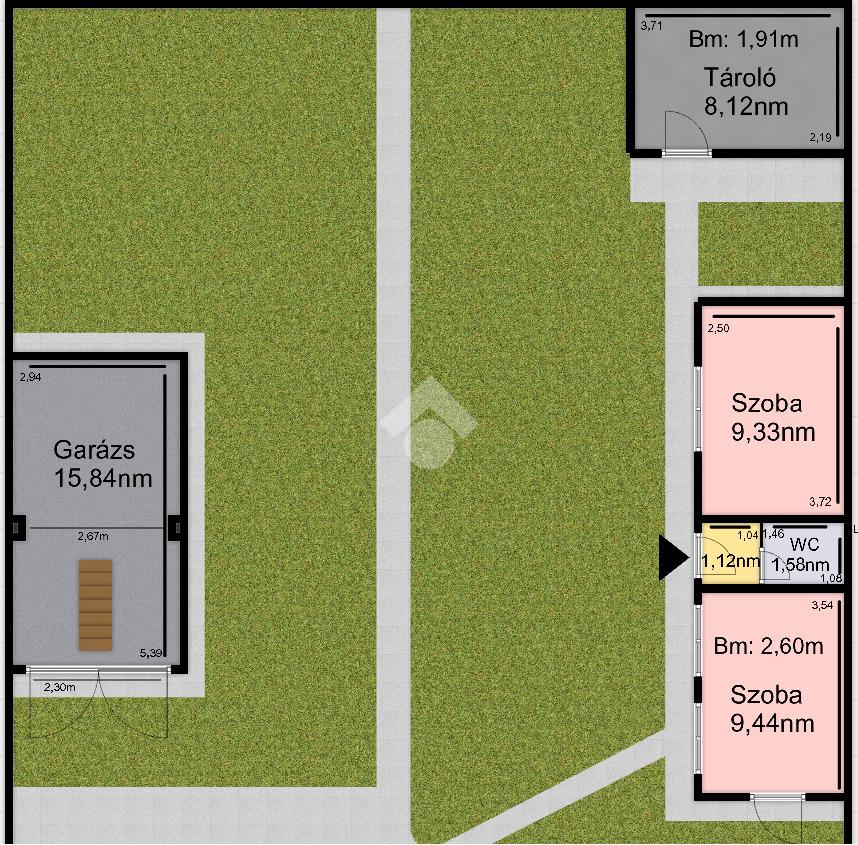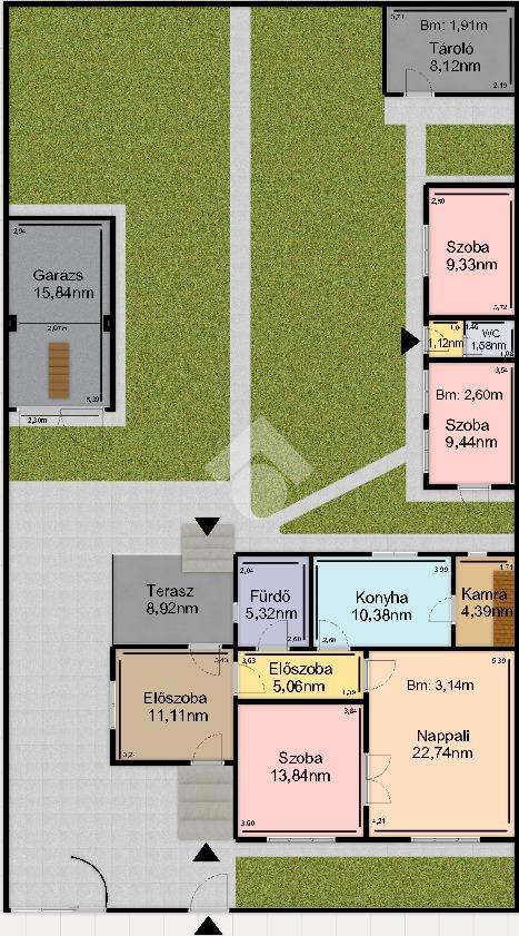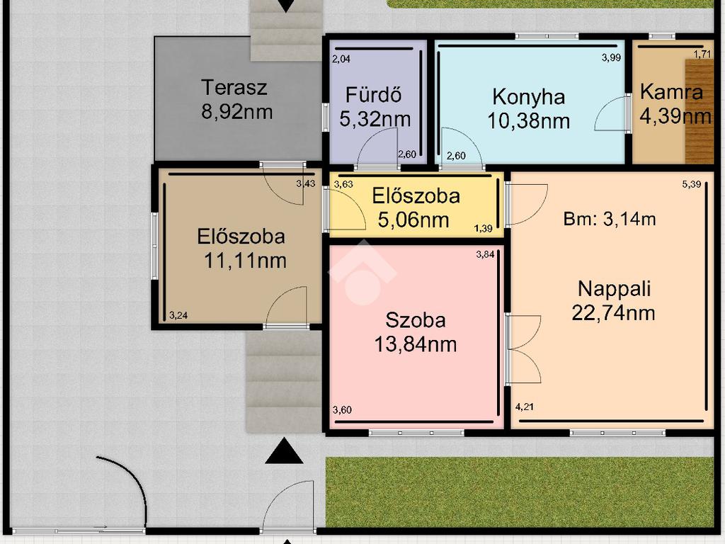 Nettó 77,3nm-es, 2szoba, előszoba, közlekedő, konyha, fürdőszoba + wc helyiségekből áll, illetve az előszobából nyílik egy 8,92nm-es TERASZ is. A ház alatt található egy kb. 10nm-es pince, ami a kamrából közelíthető meg, a padlásfeljáró is itt található. Tetőtere beépíthető, mivel beton födémes, a tető váza pedig vas szerkezetű, zsindely borítással.