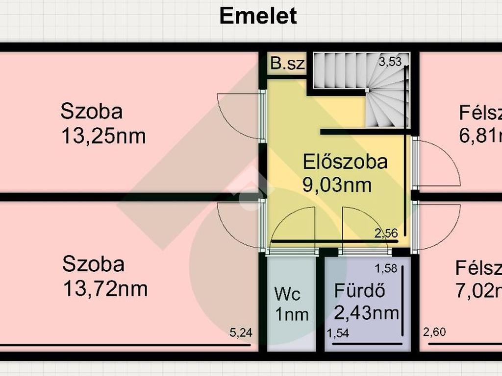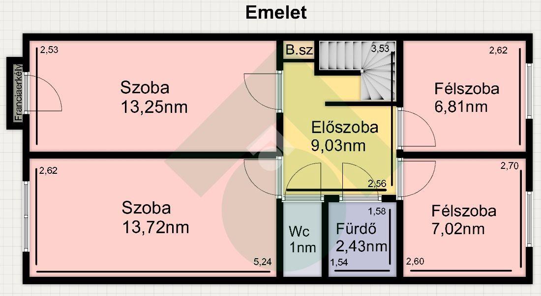 Emelet: előszoba, 2+2félszoba, fürdőszoba, wc