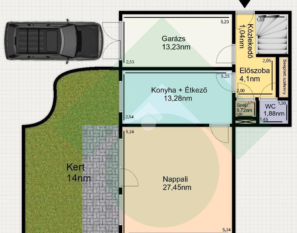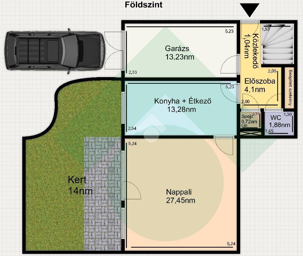 Földszint: előszoba, nappali, konyha, wc, spejz, garázs, 14nm-es kert