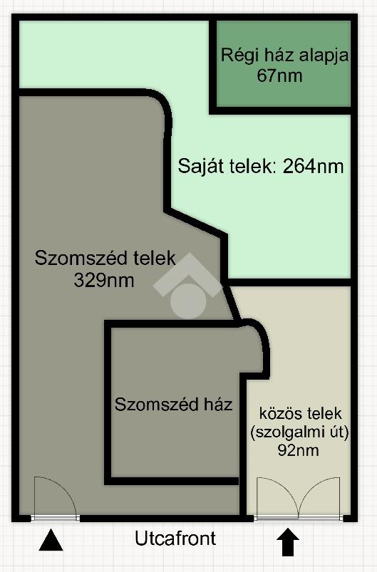 Található rajta egy elkezdett építkezés, amit nem lehet befejezni (csak a téglafalak állnak), de a betonalapra egy 67nm-es ház építhető.